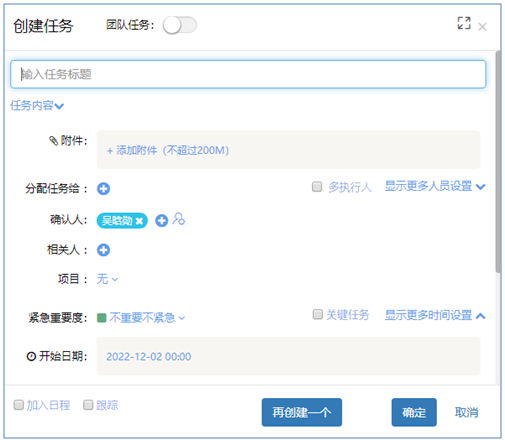 - 缺省情況我們在創建任務的時候是給某個人分配任務的,如果你要一次給多人創建一個同樣的任務需要在“創建任務”彈框中把任務創建模式設置為“團隊任務”,具體操作見下面的“7團隊任務”