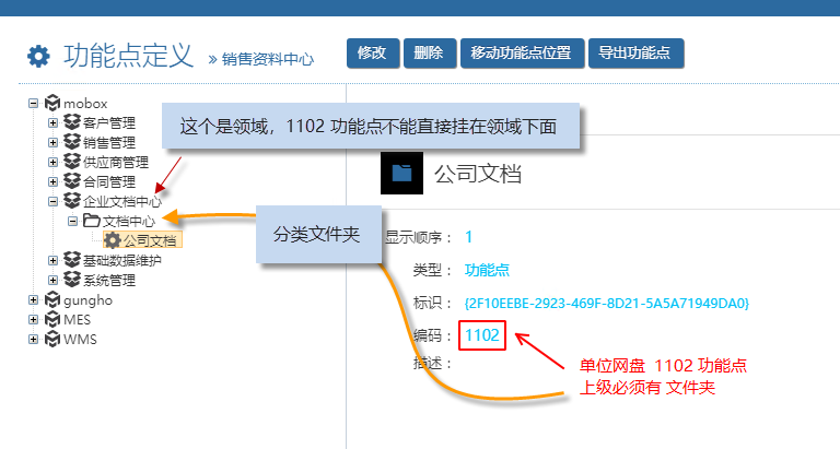 Mobox文檔中心定義 – 1101 及 1102 功能點 注意 2023/09/13 分類:產品中心 實施方案 768 mobox文檔中心可以掛接 1、單位網盤? ? ? ?(1102 功能點) 2、部門網盤? ? ? ?(1102 功能點) 在設置的Mobox文檔中心的時候,功能點不能直接掛到領域下面,而必須在領域下面先建立分類文件夾,之后才能掛接這2個功能點。 若直接掛到領域下面,會出現 而需要改成下圖發設置方法 標簽:方案 上一篇: 低代碼平臺關于數據對象定版后權限控制 下一篇: 關于Gungho及Mobox的授權(臨時授權部分)