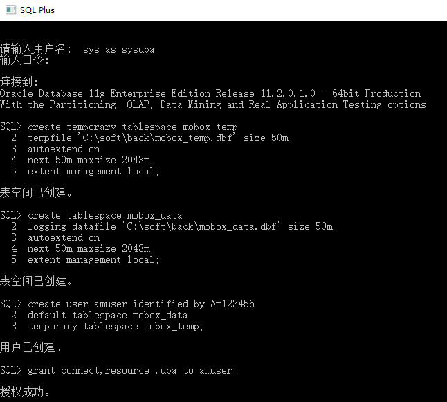 2、通過sqlplus創(chuàng)建oracle數(shù)據(jù)庫連接賬號(hào)(并創(chuàng)建空間、設(shè)置權(quán)限等),比如:amuser; (若甲方可以提供system賬號(hào)及密碼。當(dāng)前步驟可以不做