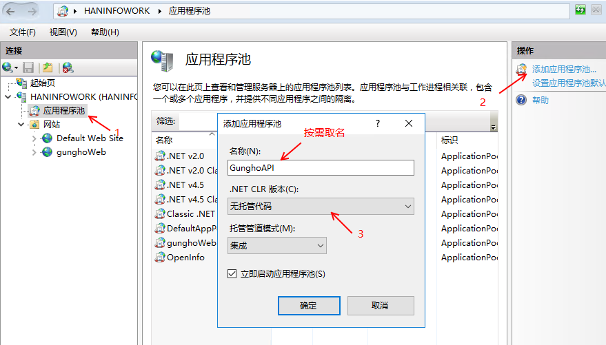 3、在 IIS 管理器中創建一個應用程序池,并將其設置為使用無托管代碼。