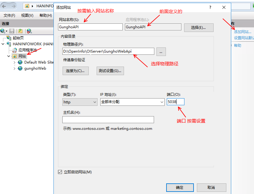5、在 IIS 管理器中創建一個新的網站或將應用程序發布到現有的物理路徑。