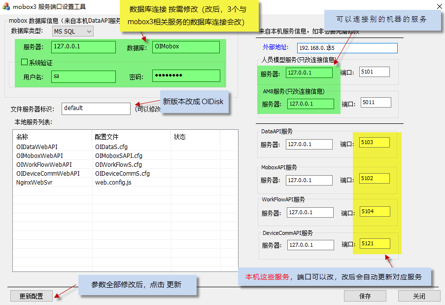 修改Mobox3系統數據庫連接及相關服務端口 2024/07/25 分類:產品中心 產品手冊 視頻中心 689 修改Mobox3系統數據庫連接及相關服務端口的作用 1、我們在實施的時候,一個工程師可能負責多個項目。而每一個項目會有自己的mobox數據庫。為了方便一個mobox3系統隨時切換不同的項目。我們可以通過修改其數據庫連接來完成 2、mobox3的端口修改,是因為,mobox3用到的端口,可能甲方不讓用,我們需要修改 實現過程 1、下載mobox3配置修改工具 點擊下載 下載后,解壓 2、按說明進行修改相關參數 參考視頻: http://m.cihuiba.com/wp-content/uploads/2024/07/mobox3cfg-modify.mp4 標簽:手冊視頻 上一篇: SQLServer數據庫備份 下一篇: mobox數據異地備份部署方案