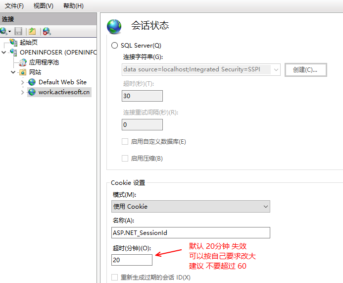 設(shè)置IIS的session (失效)過期時間(登陸后較長時間登錄有效) 2025/01/20 分類:產(chǎn)品中心 產(chǎn)品手冊 511 Mobox實(shí)施工程師希望,“mobox2一段時間不動,就需要刷新頁面,這個時間可以延長嗎,比如說頁面半個小時候沒人動,才需要刷新” 。這個需要設(shè)置設(shè)置下IIS的session 過期時間來實(shí)現(xiàn) 解決方法 1、先如Windows 的 iis 管理器 2、選擇所需要配置的網(wǎng)站 進(jìn)行調(diào)整 3、修改登錄有效時間 標(biāo)簽:手冊 上一篇: mobox3 格式化日期 下一篇: mobox預(yù)警管理平臺