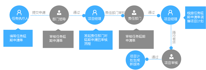 復雜計劃變更流程是一個比較嚴謹?shù)挠媱澴兏^程,首先計劃的變更肯定是由某一個任務(wù)或多個任務(wù)的延期造成計劃無法滿足預(yù)期,需要變更。因此,首先任務(wù)的執(zhí)行人提出任務(wù)延期申請,并說明原因、指出造成延期的責任部門,要求延期多少天。這些申請首先會到執(zhí)行人所在的部門,得到部門負責人的認可,然后這些申請才會到項目經(jīng)理。由項目經(jīng)理發(fā)起多部門的延期任務(wù)申請確認,通過后由項目經(jīng)理根據(jù)任務(wù)延期申請單里的信息改進項目計劃,然后走審核流程通過后項目計劃變更完成